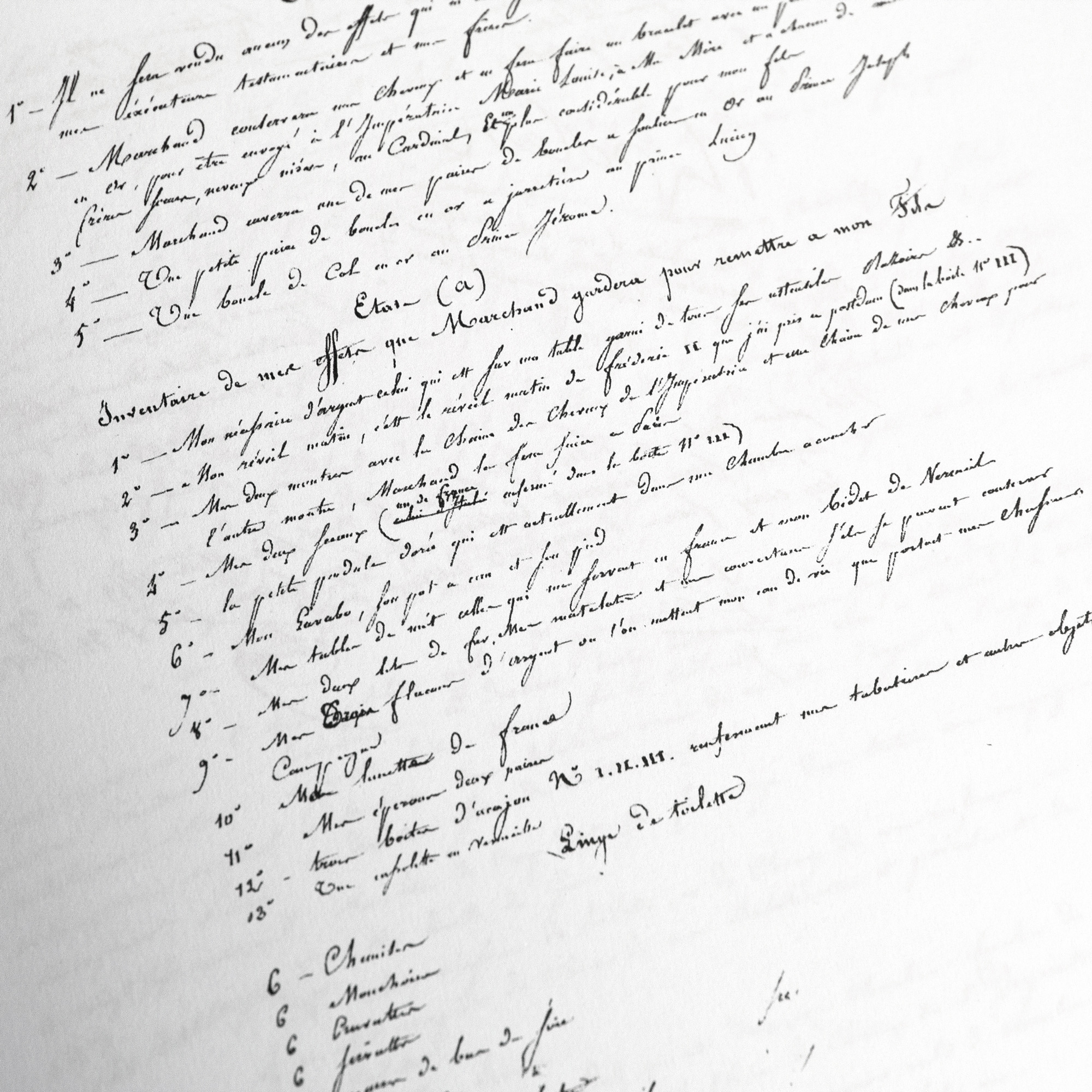 A principal act, nine codicils, inventories listing objects in his possession (furniture, weaponry, clothing) and precise instructions to the testamentary executors: the ensemble of Napoleon’s testamentary documents represents around forty pages, where his handwriting in black ink, elegant, sometimes considered, sometimes hurried, generous or parsimonious, tells the tale of his final wishes.