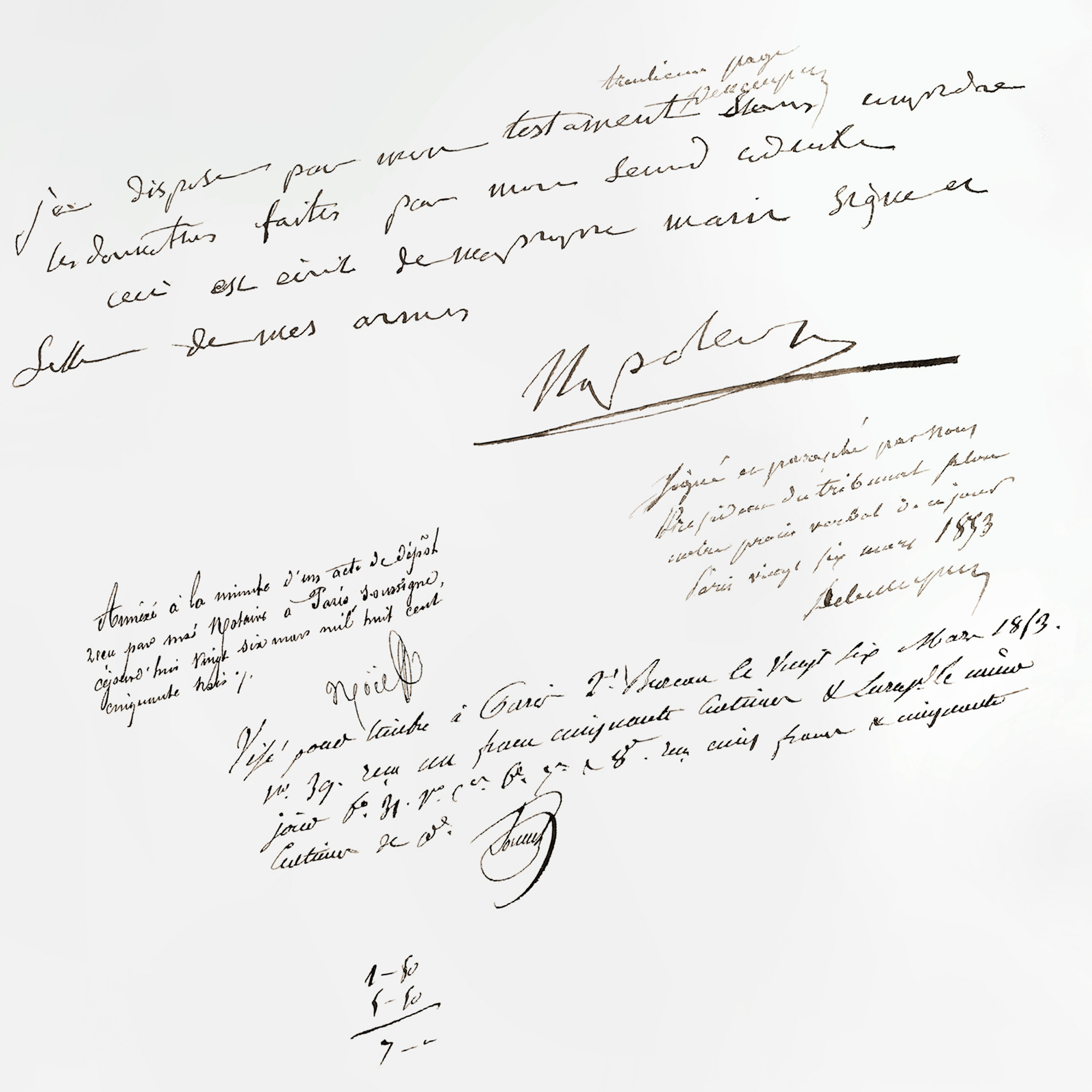 It would be necessary to wait until 1853, after a request from Napoleon III to the Queen Victoria, for the Will and its codicils be returned to the Count Walewski, ambassador of France and moreover, illegitimate son of Napoleon. The documents were presented on the 25th of March in a salon at the Tuileries, before being endorsed, signed and initialled the following day by the President of the Tribunal of the Seine, Louis-Marie de Belleyme, and finally turned over to the Imperial Archives on the 10th October 1860.